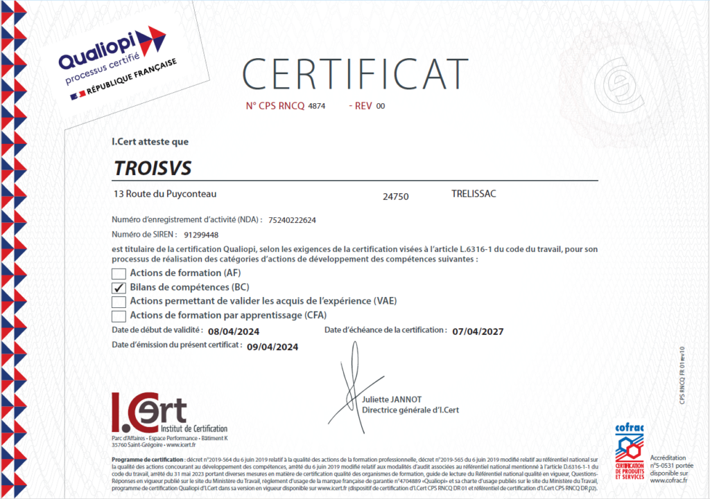 Le bilan de compétences m’a permis de mettre en avant les compétences acquises et de clarifier davantage le projet envisagé. Le débriefing réalisé à chaque séance permet de progresser et de garder un fil conducteur pour solidifier le projet. La phase de conclusion est percutante et invite à l’action.